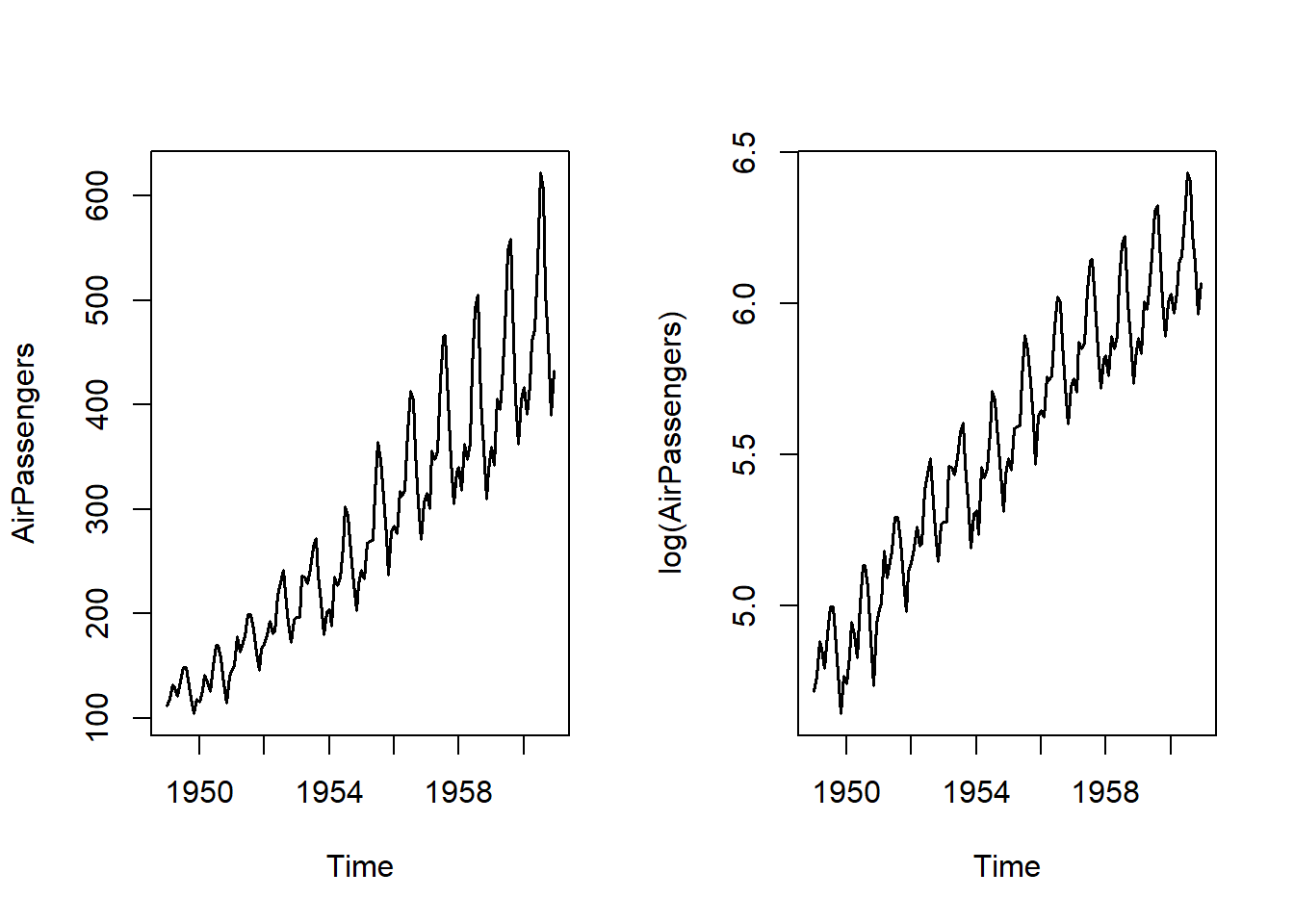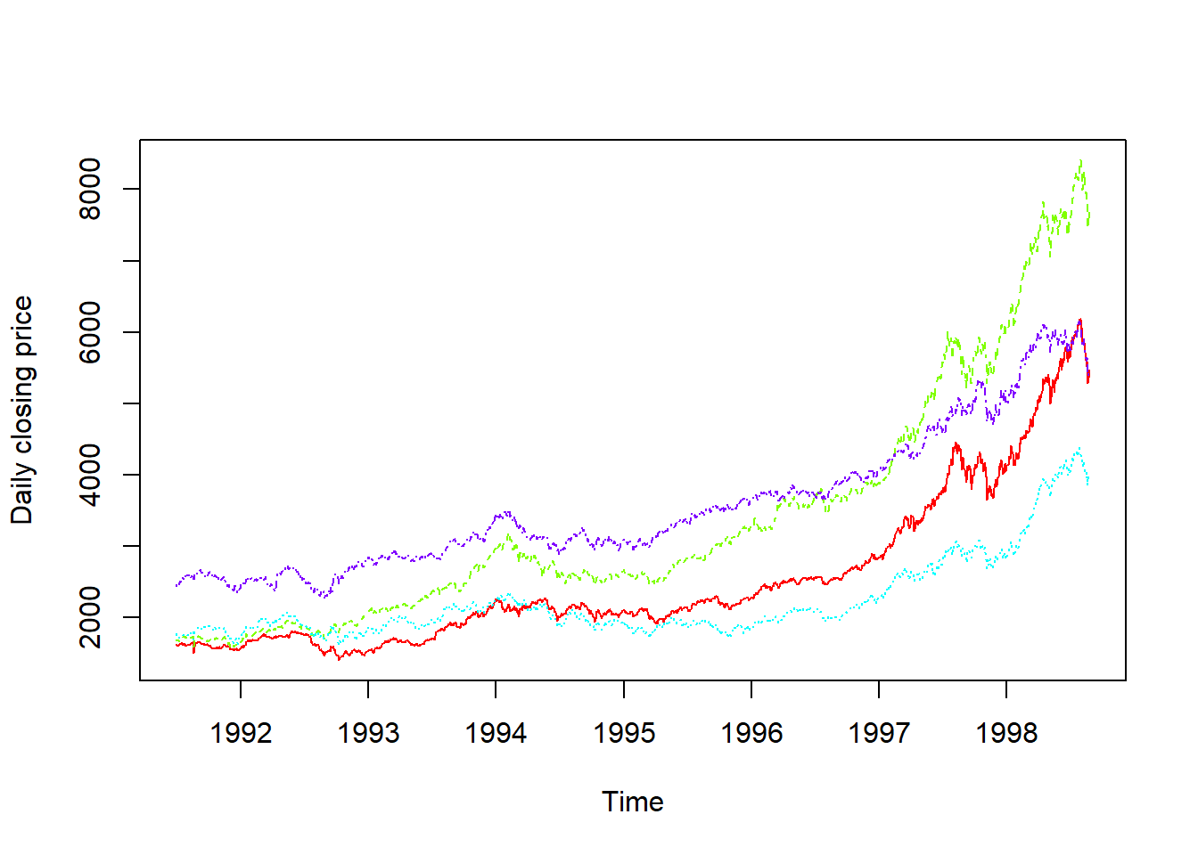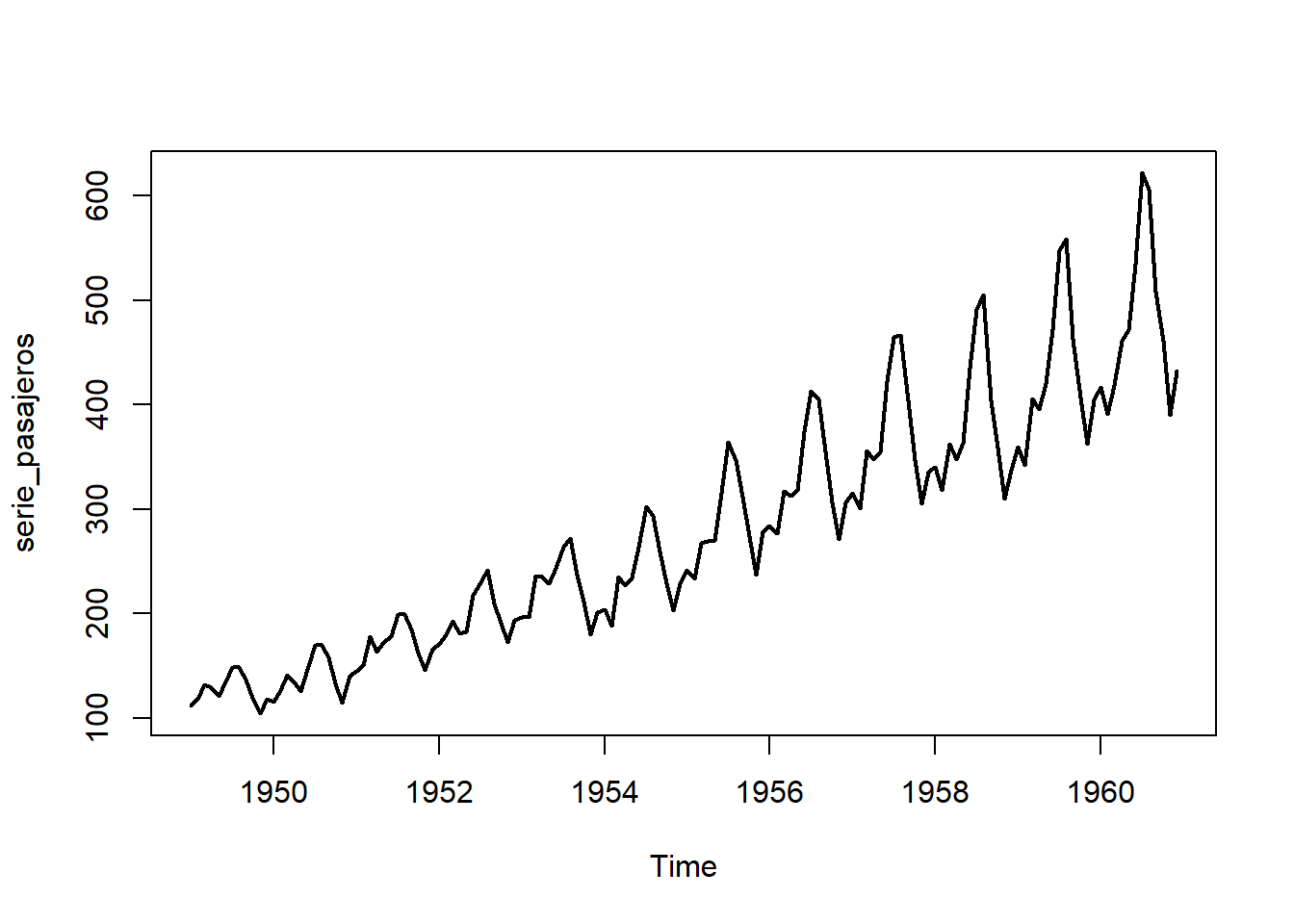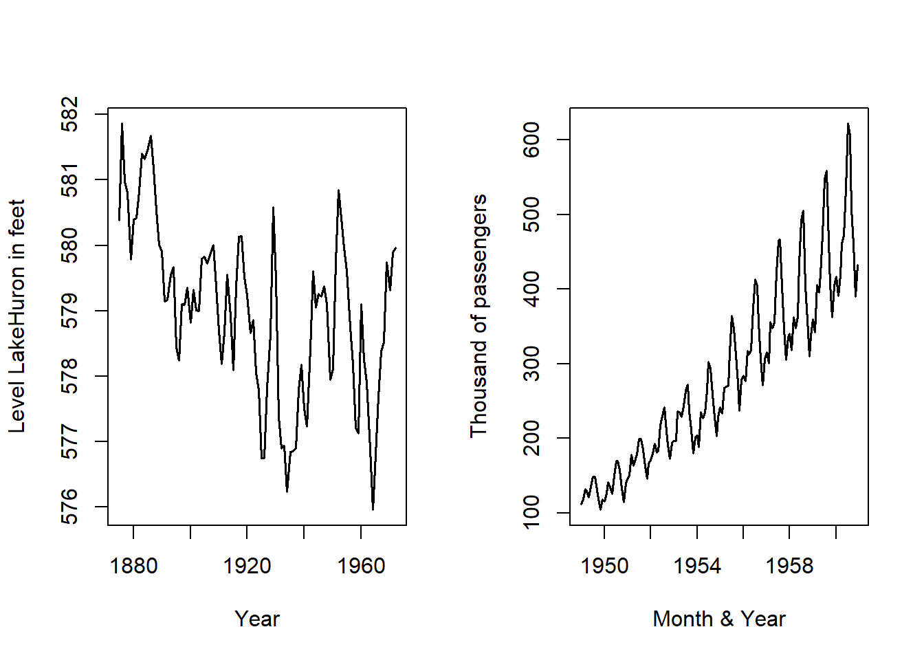 Veamos algunos ejemplos de series de datos incluidos en R. La primera, LakeHuron, contiene las medidas anuales del nivel del lago Huron (en pies), en el tramo 1875-1972. Observamos una tendencia decreciente que parece estabilizarse en el tramo final. La segunda serie de datos, AirPassengers, contiene el los viajeros mensuales en aerolíneas internacionales, en el tramo 1949-1960. Observamos un patrón periódico que se repite a lo largo de la serie, así como tendencia creciente. La tercera, EuStockMarkets, contiene los precios diarios al cierre de 4 índices stock europeos (DAX, SMI, CAC y FTSE), en el tramo 1991-1998. Observamos que las cuatro series presentan un patrón de comportamiento similar, con tendencia creciente y picos de crecimiento en los mismos tramos temporales.