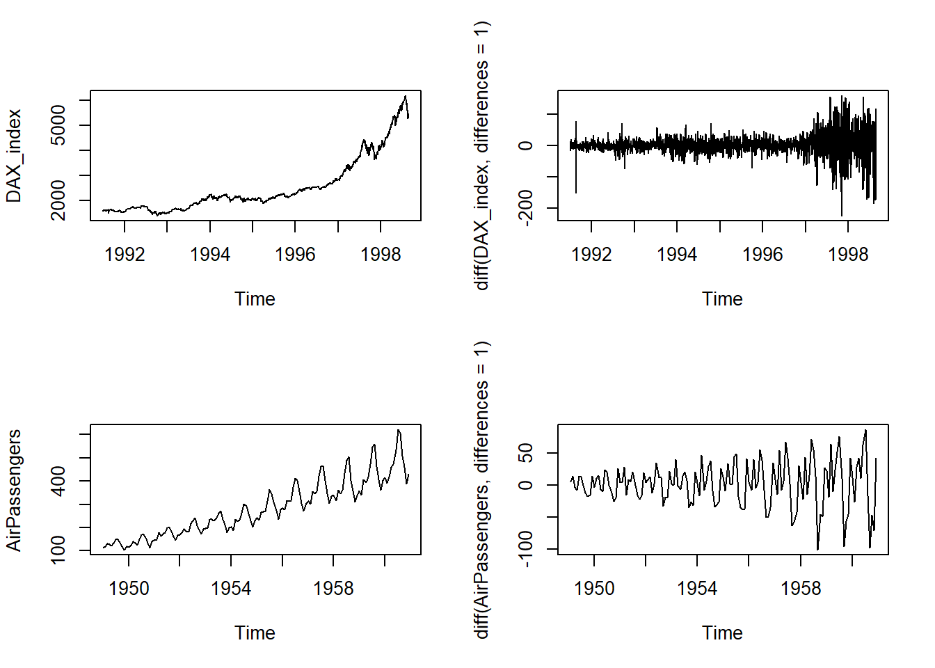 La representación gráfica de la serie temporal nos puede ayudar a decidir el tipo de tendencia de la serie, pero a veces no es tan sencillo. Un método que permite determinar el tipo de tendencia de una serie y a su vez eliminarla consiste en tomar diferencias.