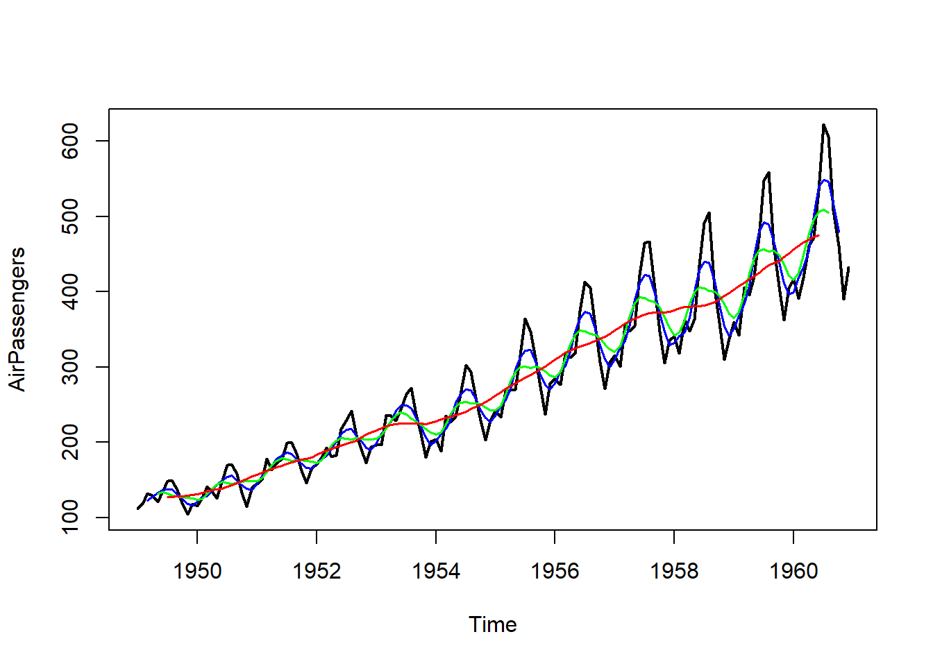 Veamos como ejemplo la descomposición STL sobre la serie “AirPassengers” incluida en R.