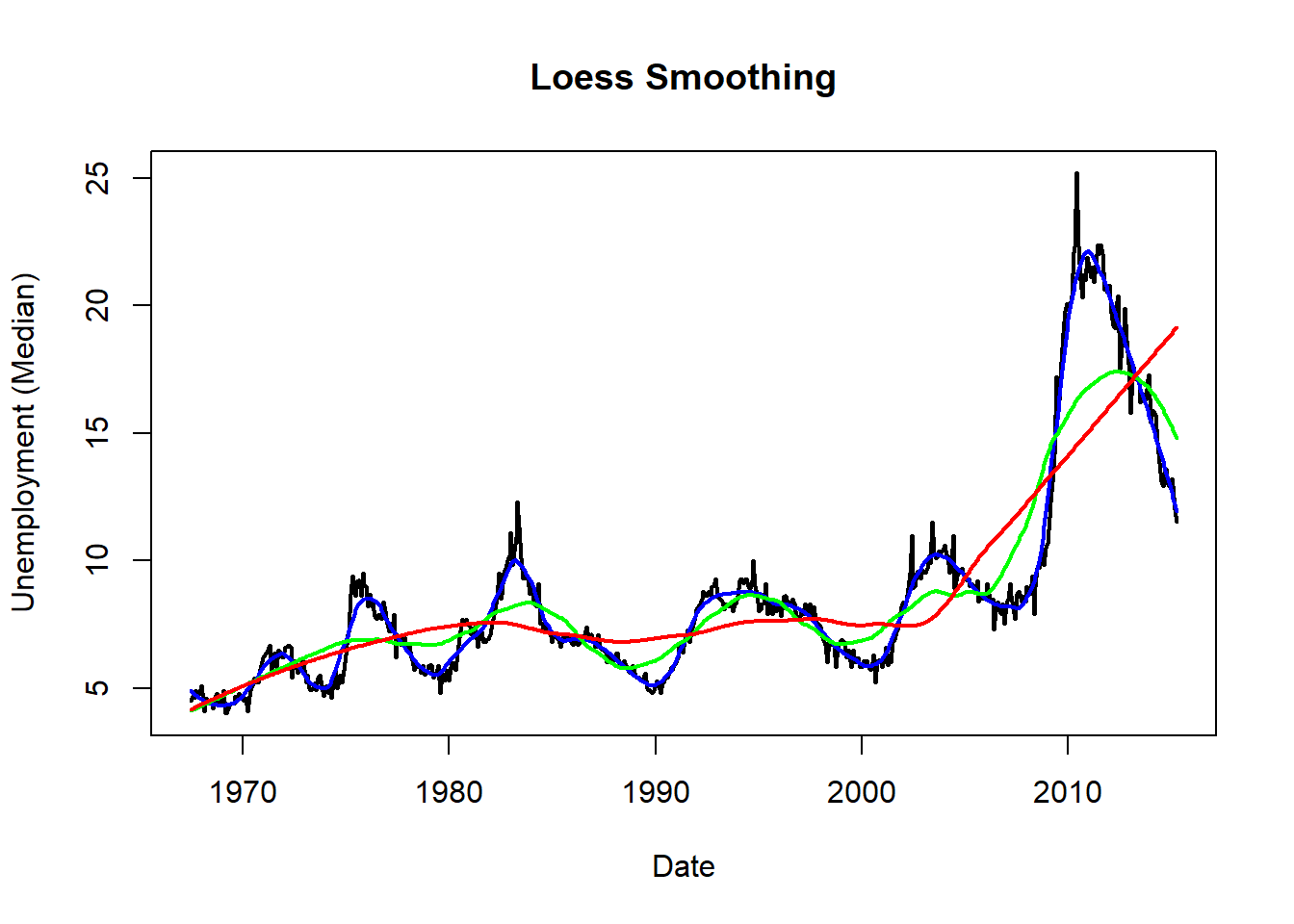 A continuación mostramos un ejemplo del método LOESS, así como el efecto del parámetro de suavizado. Para ello usaremos el conjunto de datos “economics” del paquete ggplot2, y suavizaremos la serie correspondiente al tiempo de desempleo (variable uempmed, que representa la mediana del número de días sin empleo). Observamos que la serie original (en negro) contiene numerosas irregularidades, que se suavizan al aplicar LOESS con parámetros de suavizado 10% (en azul), 30% (en verde) y 50% (en rojo). Indicar que si la serie original tiene por ejemplo 100 observaciones y se usa un suavizado del 50% (parámetro span=0.5), entonces para cada punto \(x_i\) de la serie, la ventana de vecindad se construye con 25 datos a la izquierda de xi y otros 25 datos a la derecha de \(x_i\).